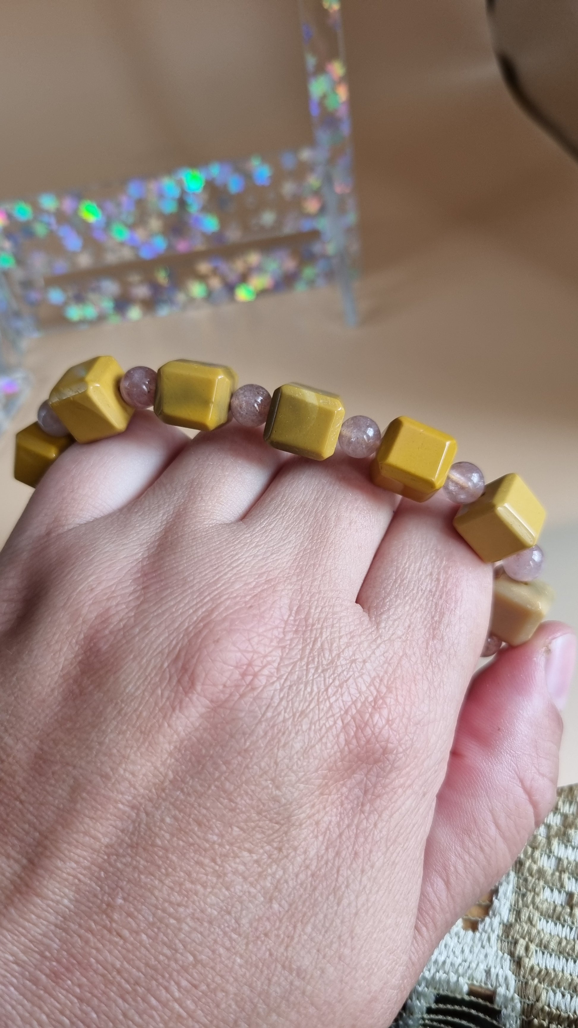 Handmade natural Stone mookite cubes 14mm and strawberry gemstone 6mm