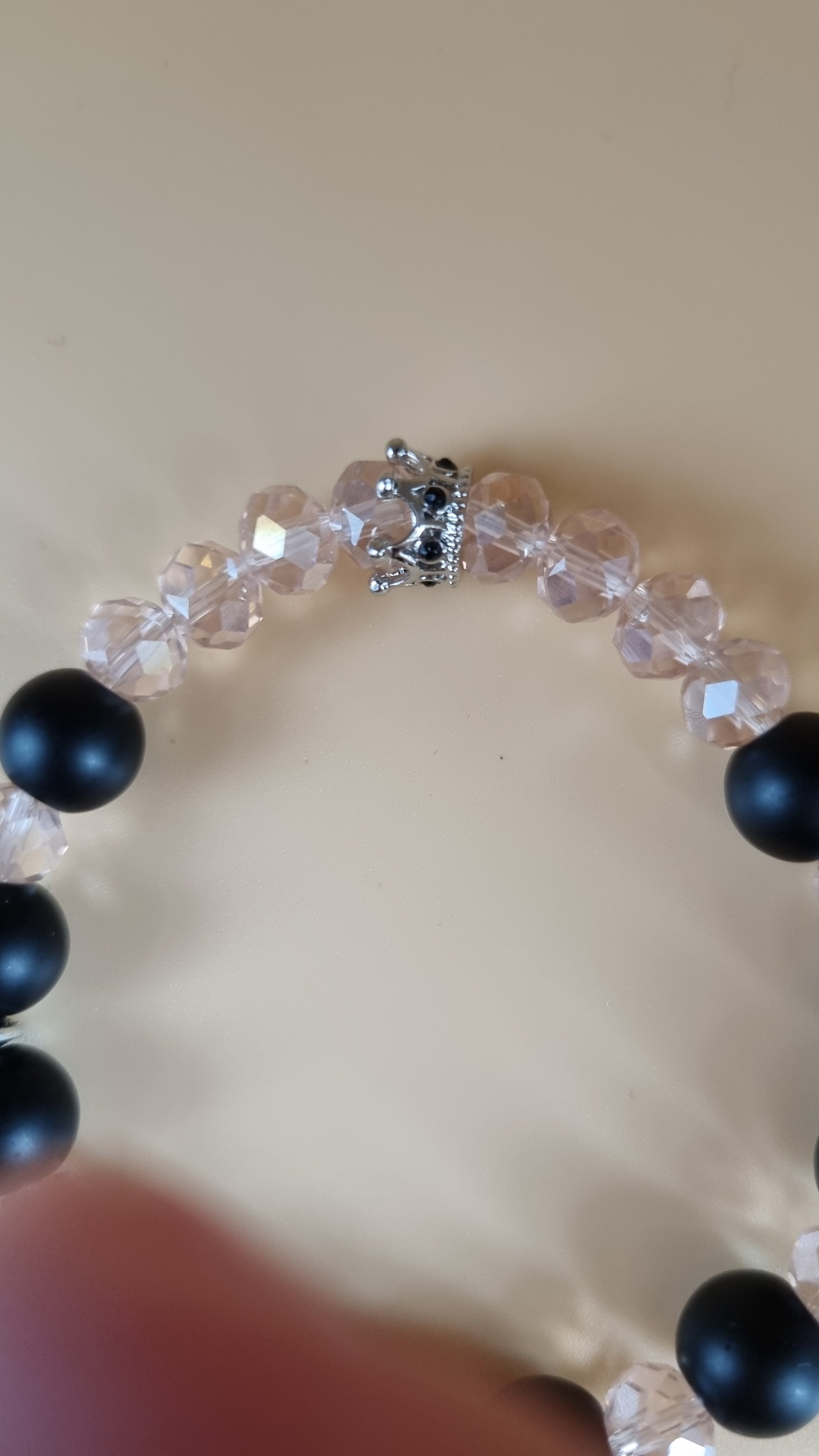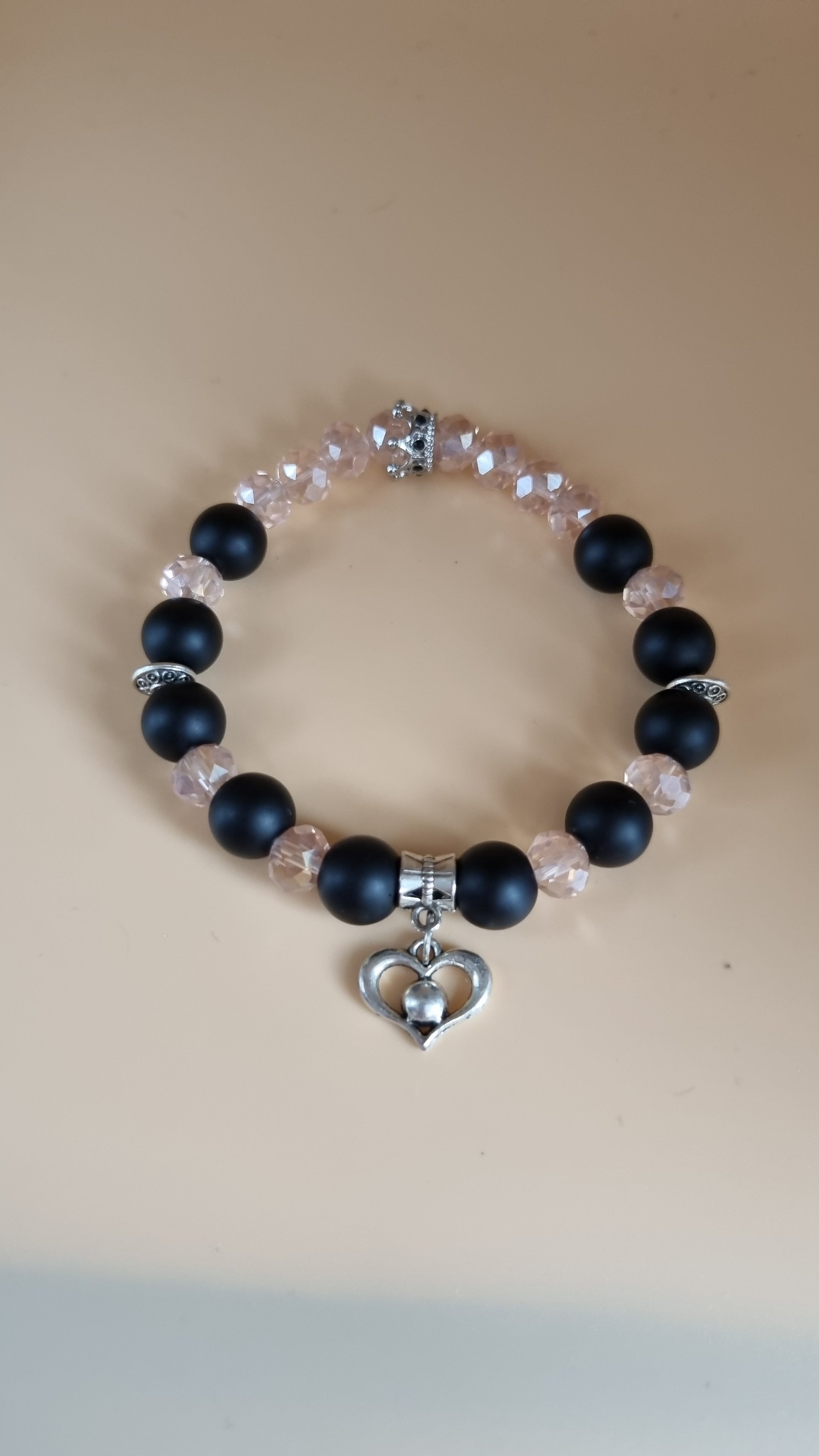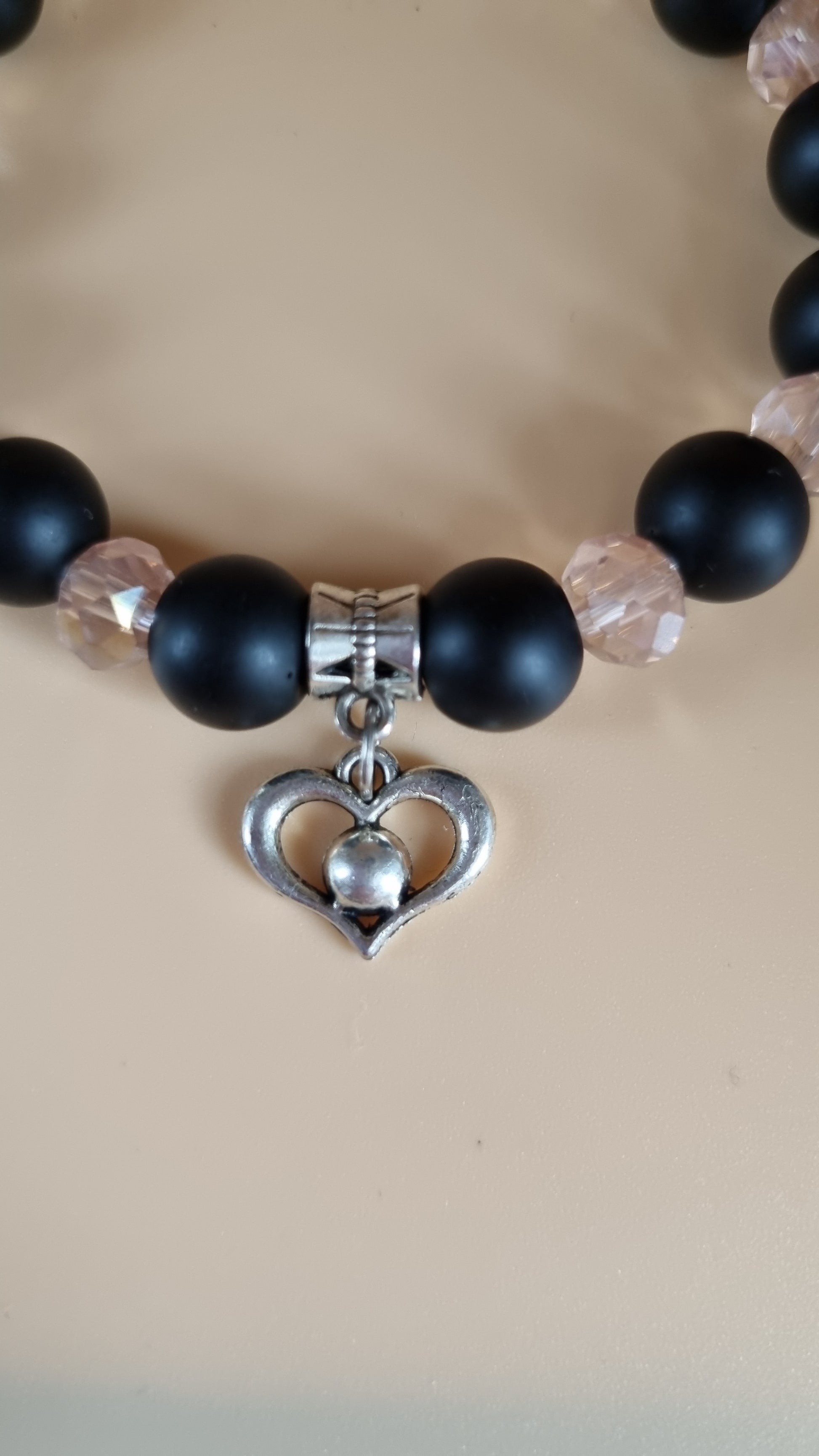 Stretchy bracelet handmade with mate onyx black and glass beads faceted pink color beads
